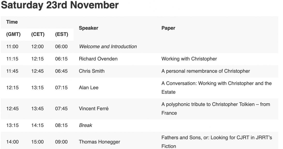Programme en ligne (plusieurs fuseaux horaires) nb : Vincent ferré, « A polyphonic tribute to Christopher Tolkien – from France » (dans la session Alan Lee / Richard Ovenden / Chris Smith)